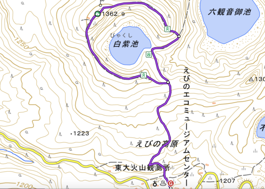 日本百名山・霧島山の最高峰は韓国岳(1700m)ですが、この連山を形成する他の山々も魅力は満載。特に韓国岳を挟んで北側にそびえる白鳥山(1363m)は、火口湖である白紫(びゃくし)池を抱いた典型的な火山で、六観音御池などの火口湖をめぐる手軽な周回コースが整備されており、スニーカーハイクにはうってつけの山です。