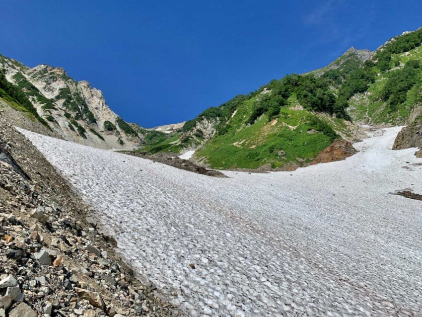 猛暑と少雪で脆くなり2023年は秋から、2024年は夏から通行できなかった白馬大雪渓(撮影:鷲尾 太輔)