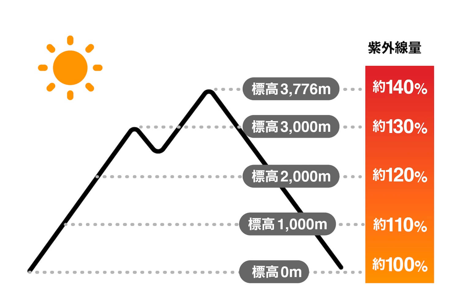 紫外線は肌ダメージの大きな要因ですが、実は標高が1,000m上がるごとに約10%増加すると言われています。例えば「富士山(3,776m)」の山頂は、市街地の約1.4倍の紫外線が降り注いでいるということ。