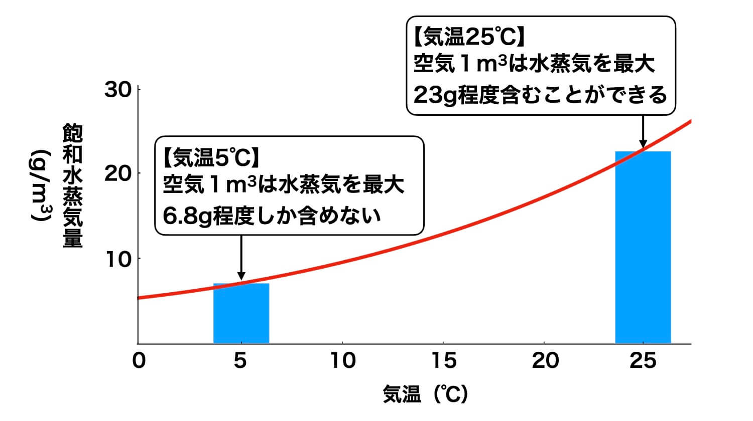 空気が含むことができる水蒸気の最大量(飽和水蒸気量)は気温が低くなるほど少なくなる。上記グラフは中学生で習う「気温と飽和水蒸気量の関係図」