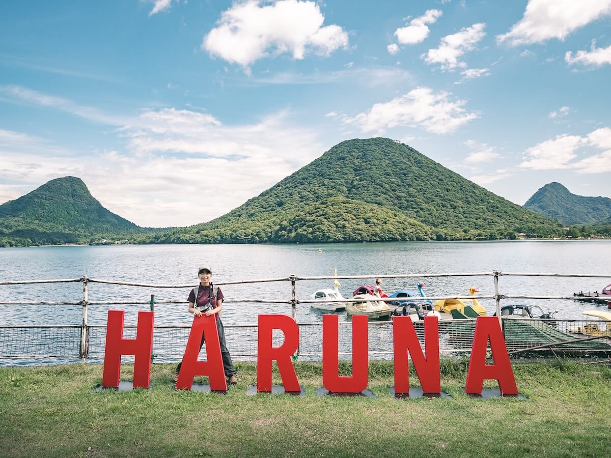 榛名湖の奥には堂々たる山容の榛名富士が見える。「HARUNA」のモニュメントの前でパチリ