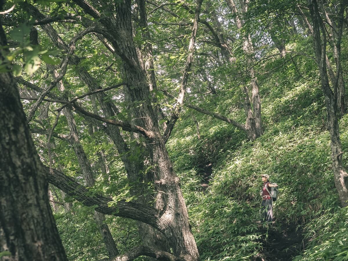 登山道に入ると、心地よい樹林帯が広がっていました。木漏れ日が差し込み、風が吹くたびに斜面を覆うクマザサがさわさわと揺れ、耳にやさしい音を届けてくれます。ところどころ段差はあるものの、道は基本的につづら折りで歩きやすく、自然のリズムに身を委ねながら快適に登ってゆけます。