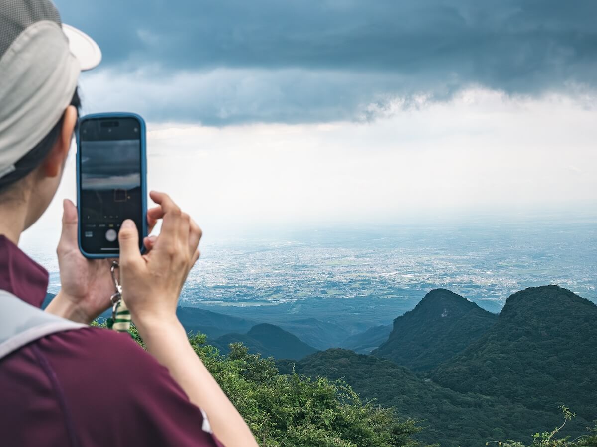 展望台からの景色を見て、撮影のためスマホを取り出すミノリさん