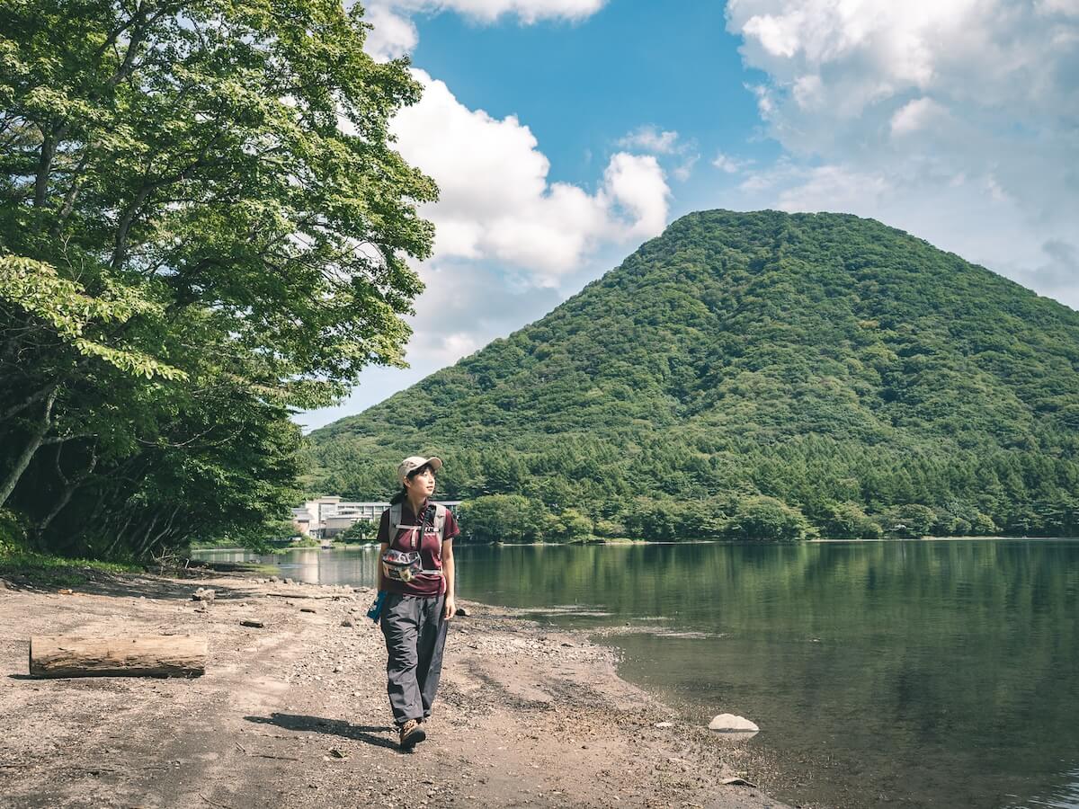 榛名富士を後にして、湖畔へと下ります。目の前に広がるのは、青く澄んだ榛名湖。念願の水辺ハイクに、ミノリさんも思わずにっこり。「水辺の道を歩けるなんて最高ですね!」と足取りも軽やか。