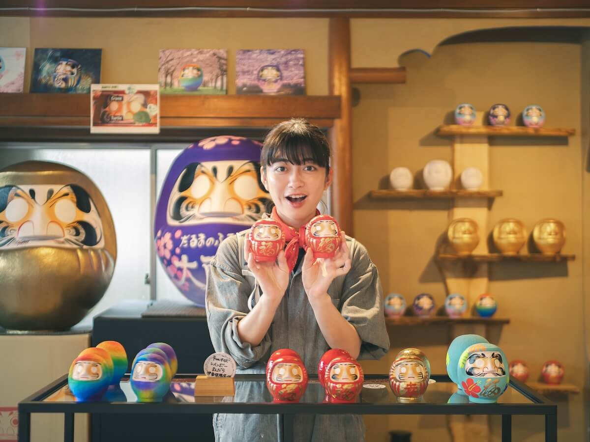 そんな石段の166段目にあるのが「IKAHO HOUSE 166」。築100年超の旅館をリノベーションした複合施設で、飲食やショッピング、工芸体験まで楽しめます。ミノリさんが訪れたのは、榛名山麓の「卯三郎こけし」と高崎の「大門屋だるま」のアンテナショップ。こけしはクラシカルなものからキャラクターものまで幅広く、絵付け体験も人気。一方の大門屋では、伝統の達磨に新しいデザインを融合したアイテムが並びます。