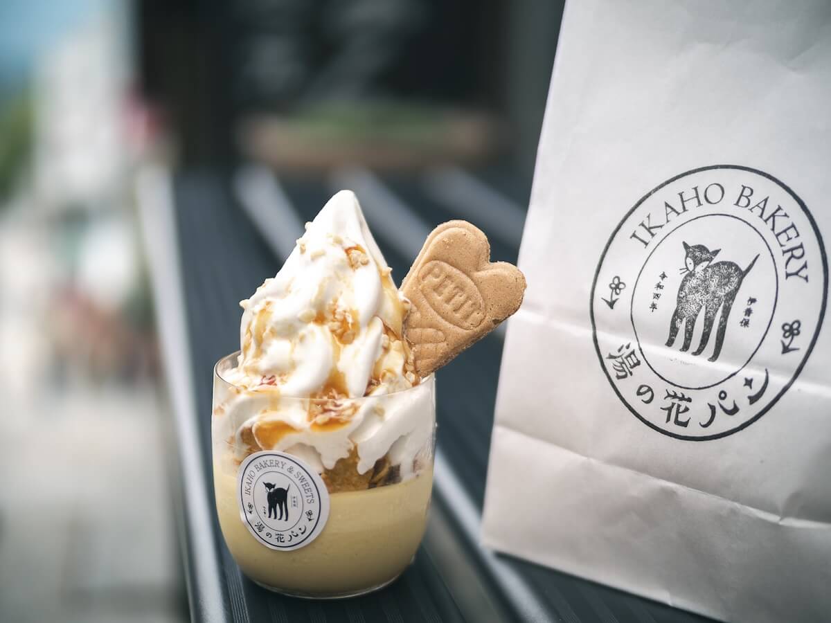 石段街を散策する途中に立ち寄りたいのが、ホテル松本楼のベーカリー姉妹店「湯の花パン」。ここで人気なのが、この店でしか味わえない特製スイーツ「石段ぷりんソフト」です。なめらかな自家製プリンの上に、榛名牛乳を使った濃厚なソフトクリームをのせ、仕上げに湯の花をイメージしたキャラメルソースをとろり。甘く贅沢な味わいに仕上がっています。