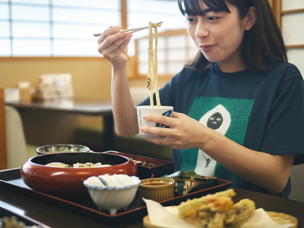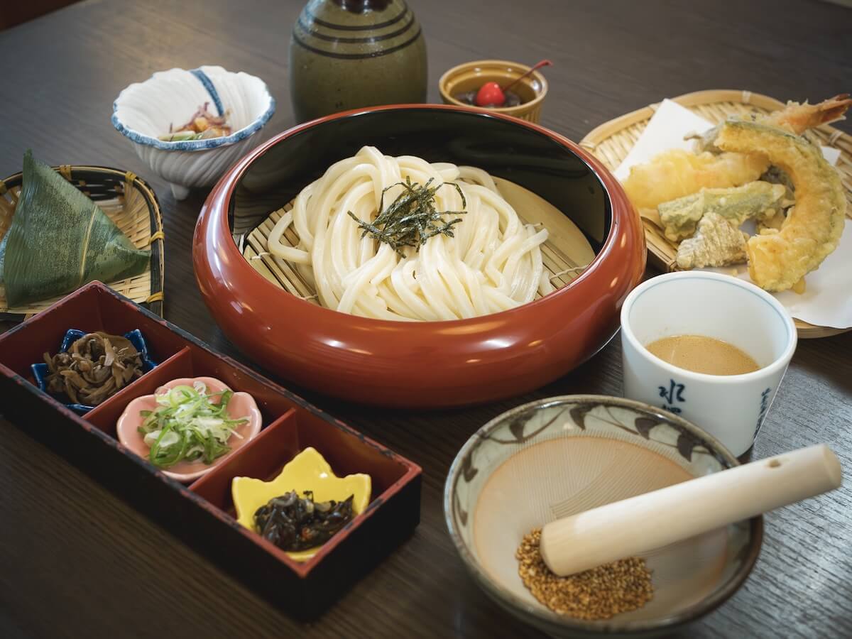 水沢山を下ると、目の前に現れるのは「水沢うどん街道」。古刹・水沢観音の門前には名店がずらりと軒を連ねています。ここで味わえる水沢うどんは、香川の讃岐、秋田の稲庭と並ぶ“日本三大うどん”のひとつ。400年以上の歴史を誇り、小麦粉・塩・水だけで打たれる麺は、つややかでコシが強く、ツルリとした喉ごしが魅力です。