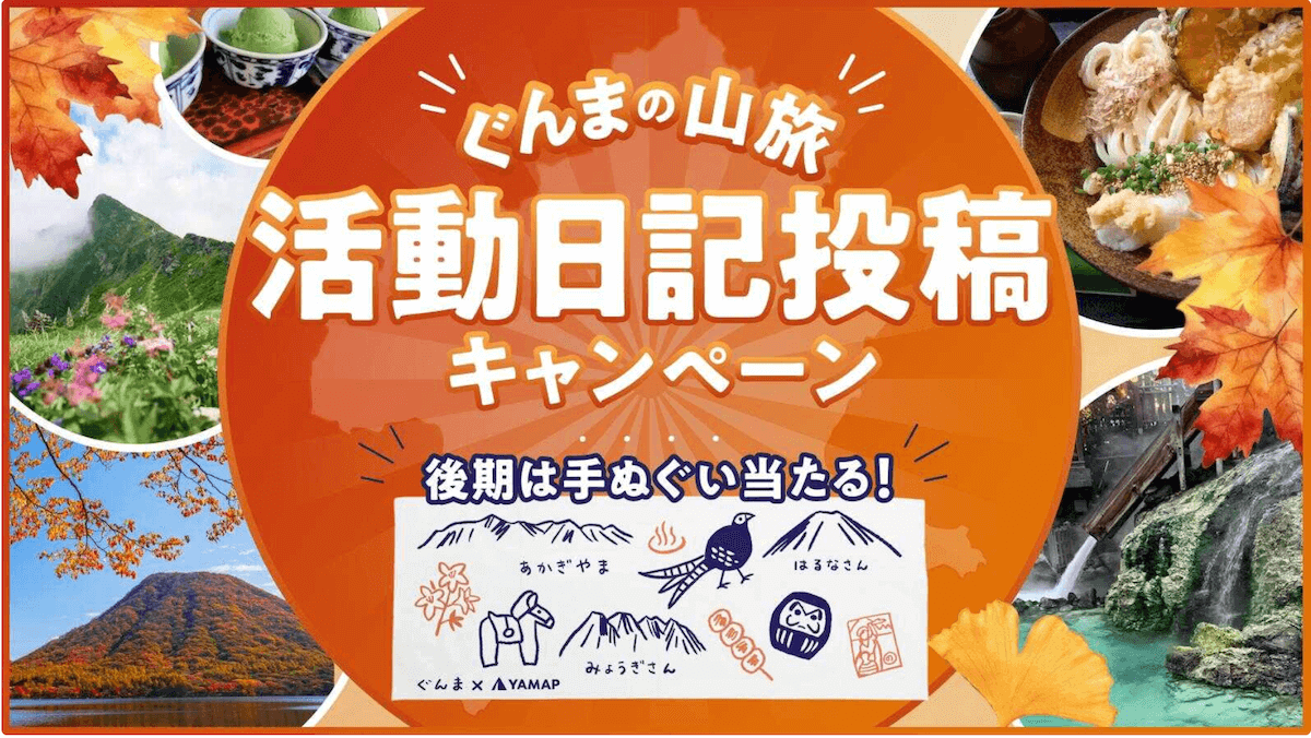 そして現在、YAMAPと群馬県とのコラボ企画「活動日記投稿キャンペーン」(後期)が開催中。11月16日までに「#私がみつけた群馬2025」をつけて投稿してくれた方には「群馬の宿で使える宿泊券(1万円分)」や「オリジナル手ぬぐい」が当たるチャンス、さらに条件達成で「限定デジタルバッジ」も手に入ります。YAMAPユーザーなら誰でも参加OKなので、この記事を参考に群馬の山旅の思い出をシェアして一緒に楽しみましょう!