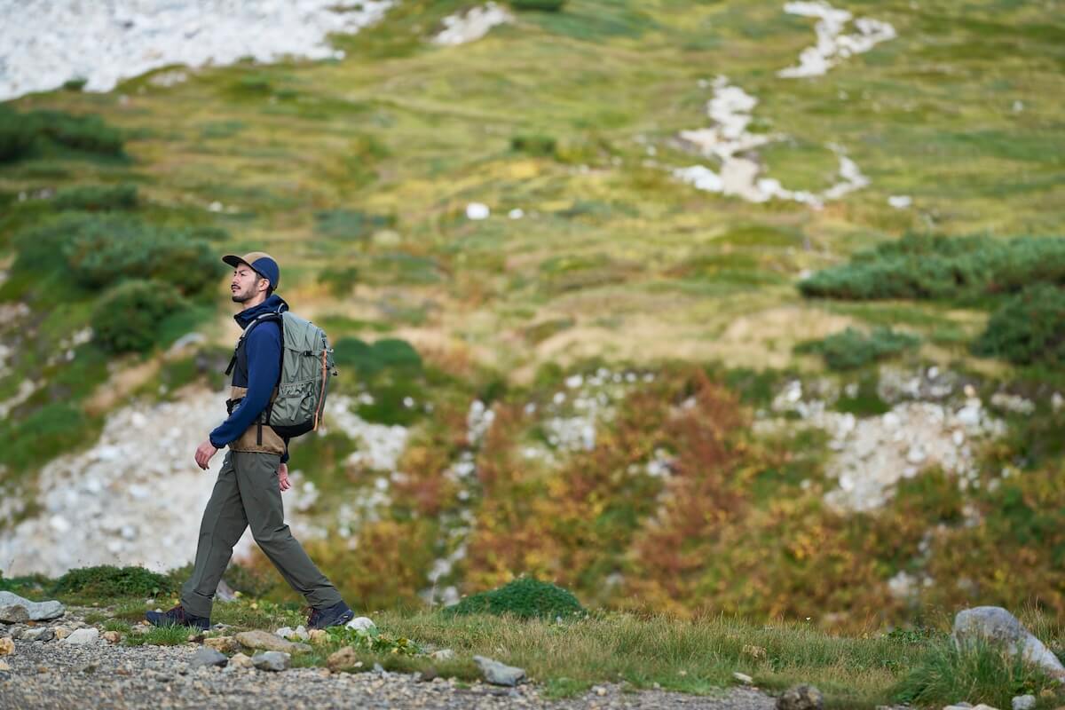 また、素材のストレッチ性を最大限に活かすため、体にフィットするシルエットが採用されています。ダブつかないので、稜線上などの風が強い場所ではレインウェアと重ね着したり、テント場での停滞時はダウンと重ねたりと、ミッドレイヤーとしても活躍。肌寒くなってくるこれからの季節は、1日中、出番が多くなるはずです。