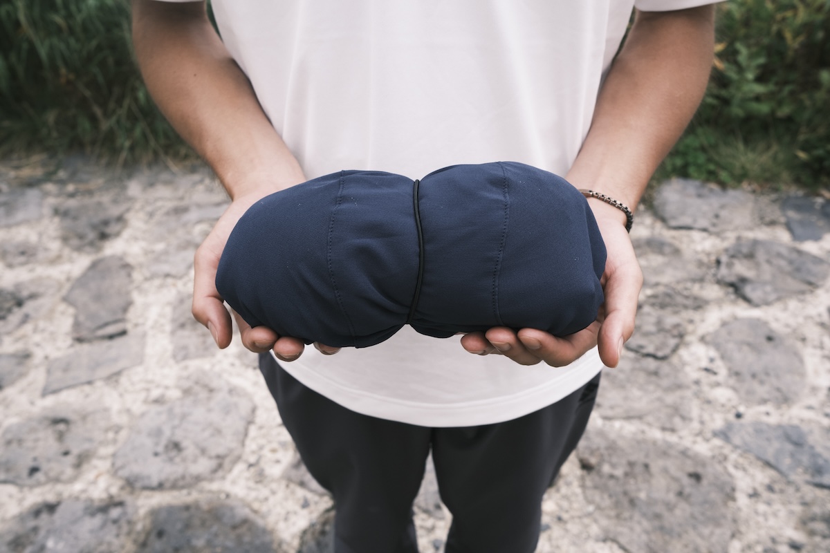 袖口や裾はドローコードではなく、軽量なストレッチバインダーを使用。シンプルながら、可能な限り重量を抑えつつ、風の侵入を防いでくれるディテールとなっています。