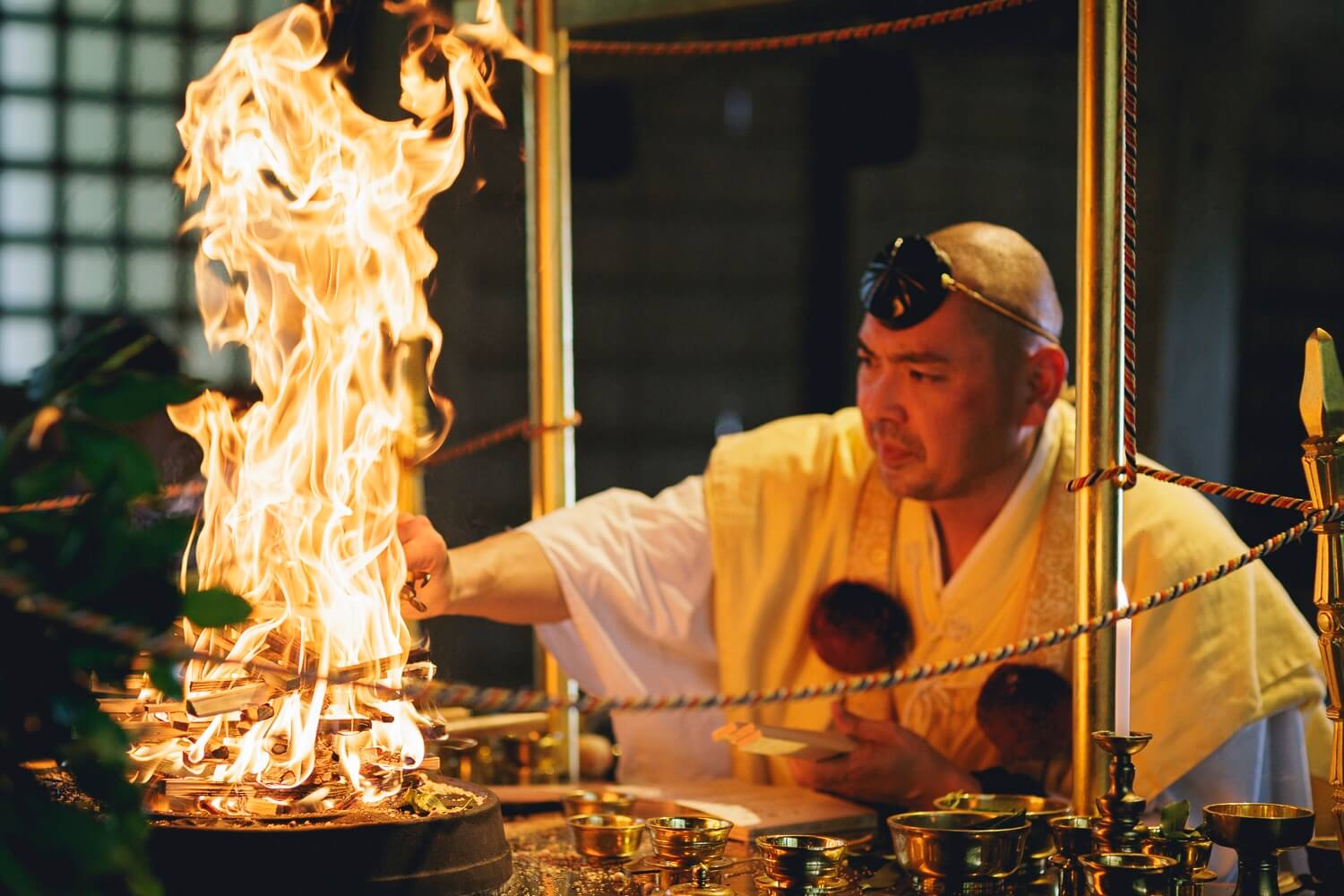 祈祷を行うのは、自らも修験者として山々を渡り歩く英彦山神宮の禰宜(ねぎ)、高千穂有昭さんです。読経が響く中、護摩壇の炎がパチパチと音を立て、白い煙は光の筋となり、場を包み込みます。