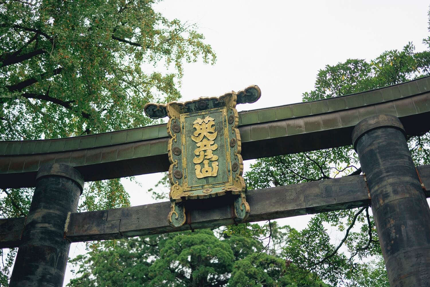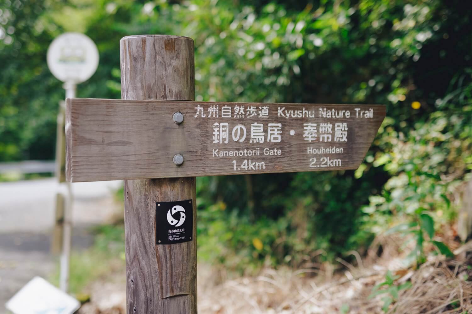 1637年に佐賀藩主の鍋島勝茂の寄進により建てられた青銅製の鳥居(国・重要文化財)。「英彦山」の扁額は1729年に霊元法皇が下賜したもの。額の縁には八個の菊花御紋章が施されている