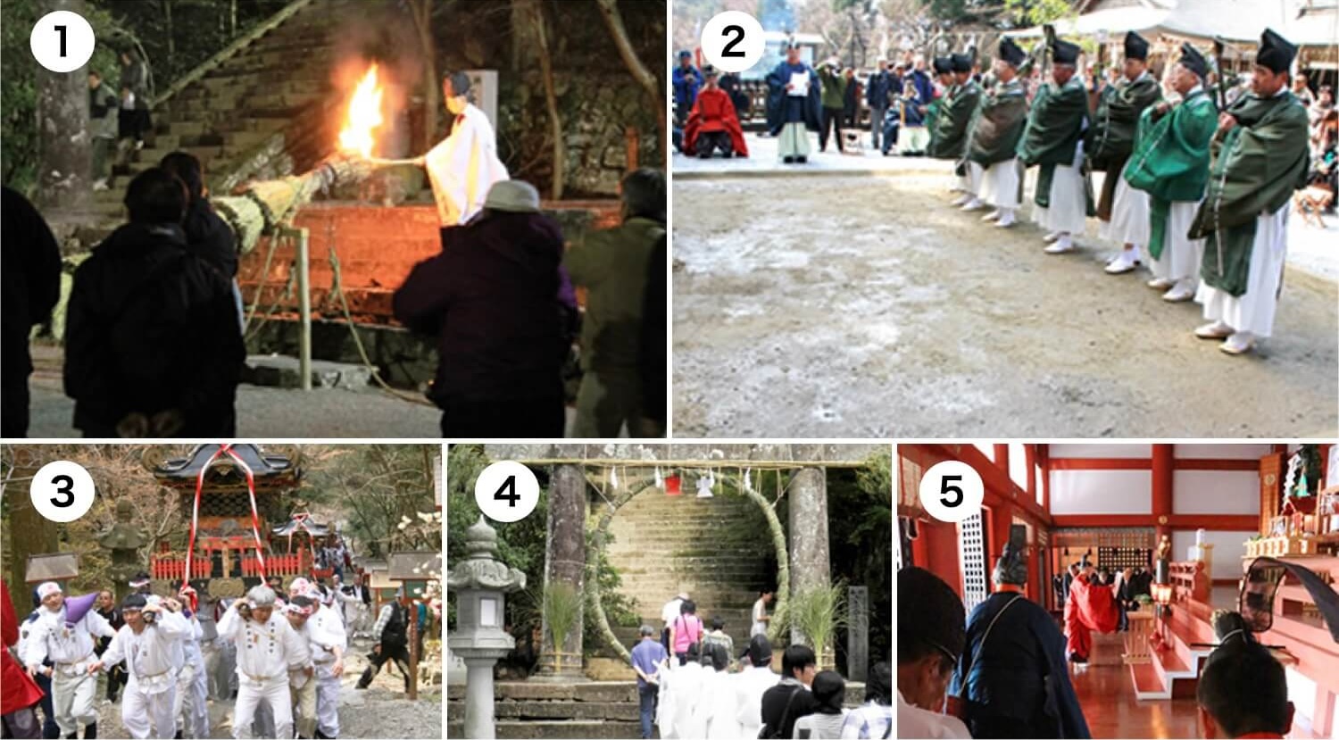 ①松柱神事(1月)、②祈年御田祭(3月)、③御神幸祭(4月)、④大祓式・茅の輪くぐり(7月)、⑤例大祭・権現講社大祭(9月)。写真提供:英彦山神宮。各祭典の詳細日程は下記ボタンから