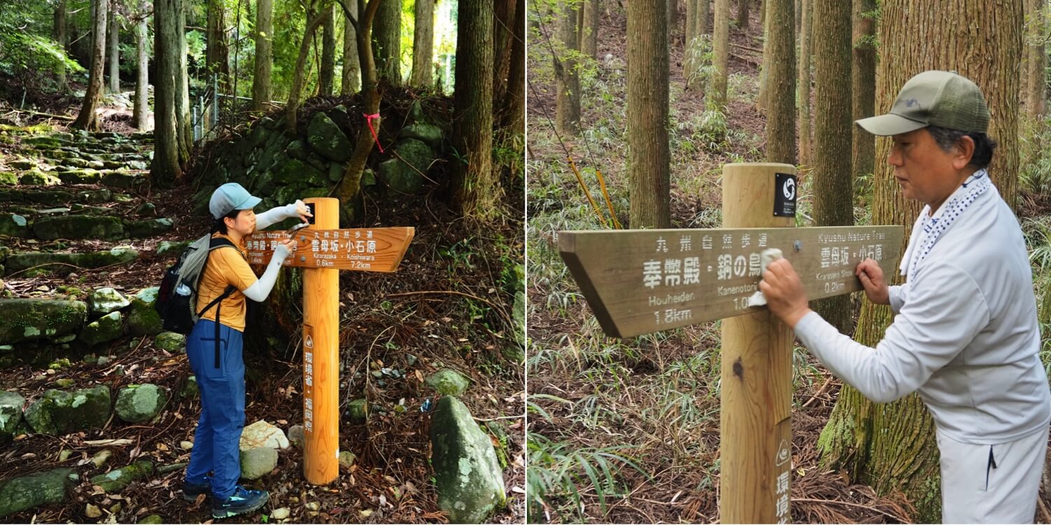 嘉穂三山愛会・九州自然歩道フォーラム・福岡県観光連盟・YAMAPの4者で実施した「英彦山巡礼路春峰ルート」の整備活動もその一環。2025年9月下旬に、秋月 古処山登山口〜英彦山神宮 銅鳥居に点在する道標の清掃と約40本の道標への巡礼路サインパネル設置を行いました。