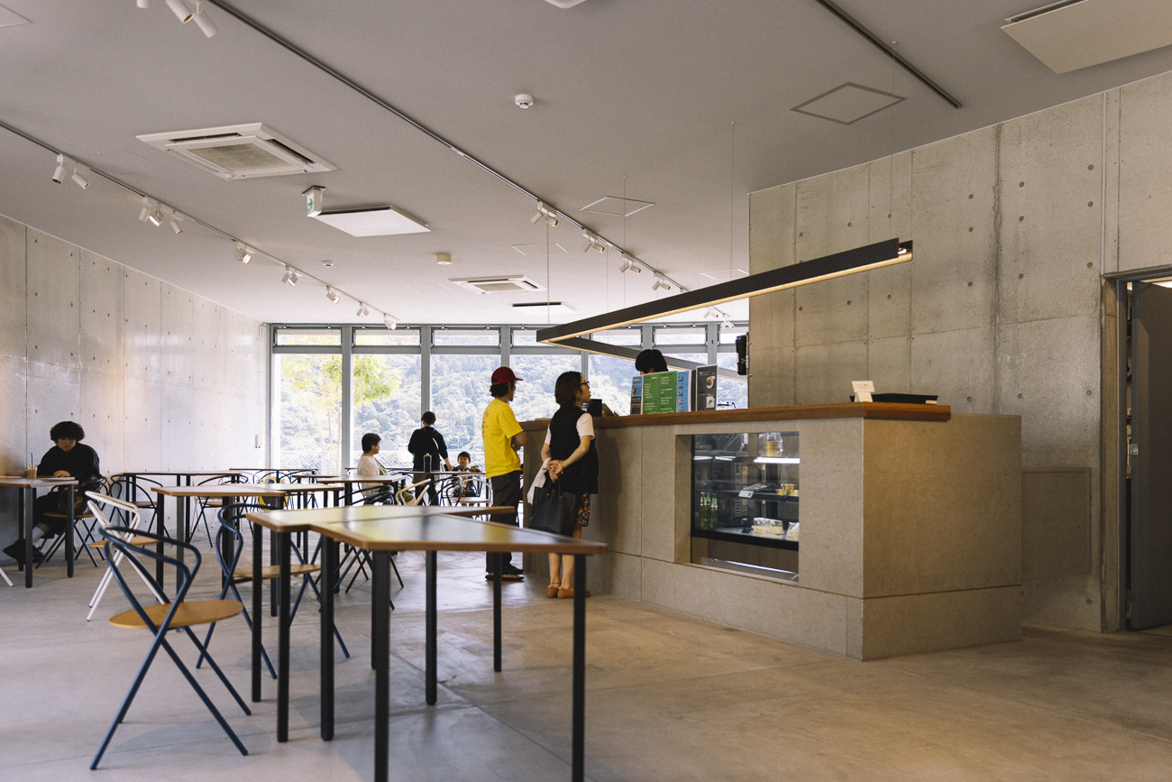 五ケ山ダムの湖畔に立つ、ガラス張りのカフェ「TRÅIL(トレイル)」。歩いたあとのひと息をここで。