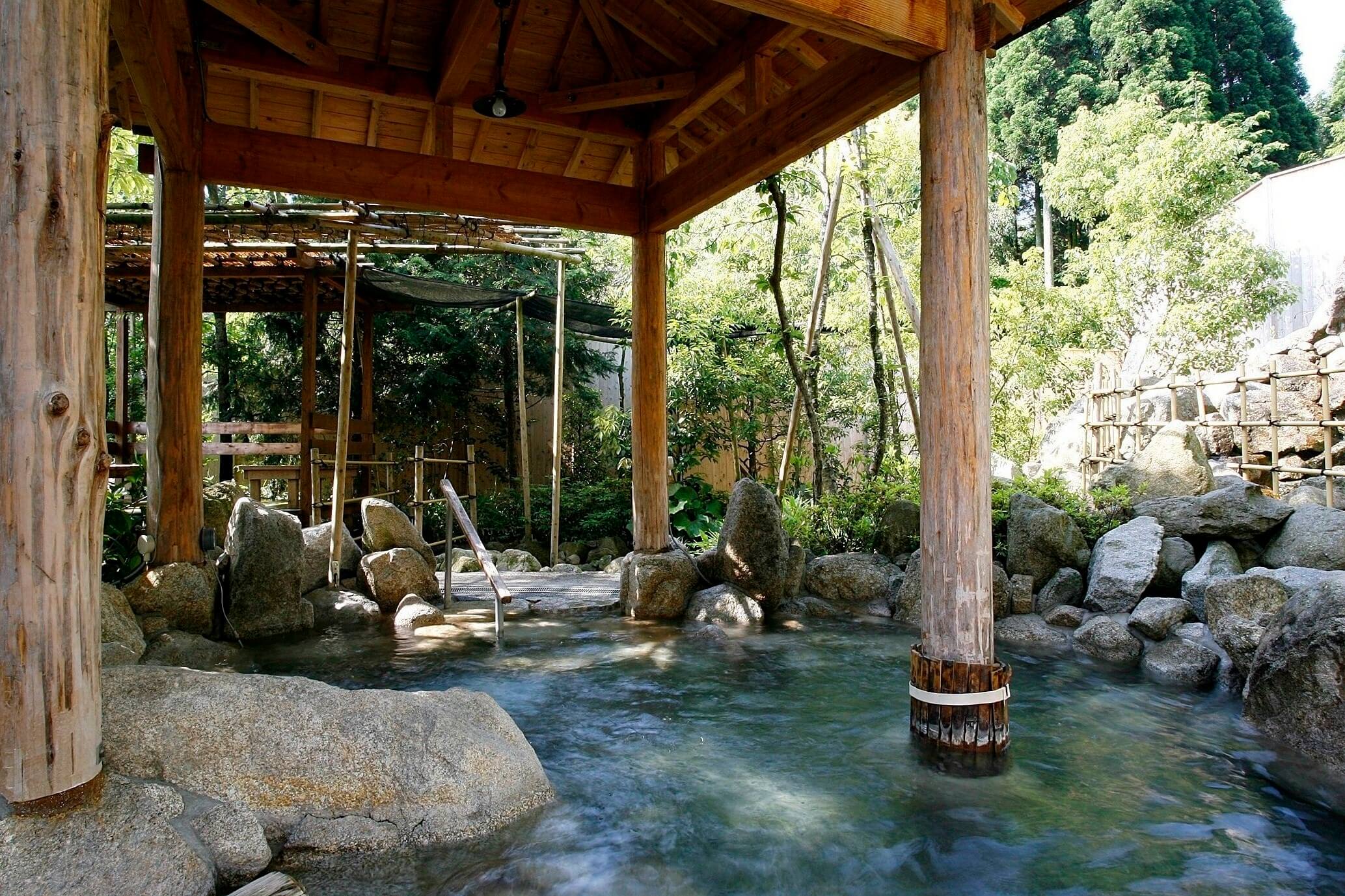 五ケ山クロスリバーパークから車でおよそ15分、那珂川の森に抱かれるように佇む「那珂川清滝」は、背振山麓の地下深く、早良花崗岩から湧き出る天然温泉です。