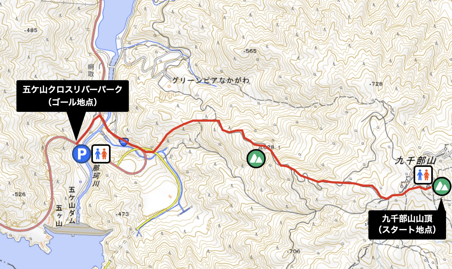 今回歩いたのは、2時間弱の行程となる九千部山山頂から五ケ山クロスリバーパークまで下るコースです。(地図をタップすると拡大できます)。該当の地図はこちら