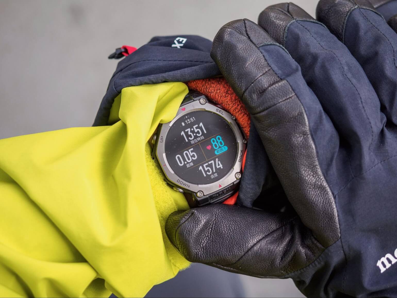 A3:まったく同感です。これも私の長年の悩みでした。特に冬山でシェルを着込んで手袋を着けていると、ウォッチを見たいときに隙間から掘り出すようにしないとならないのがストレスでした。