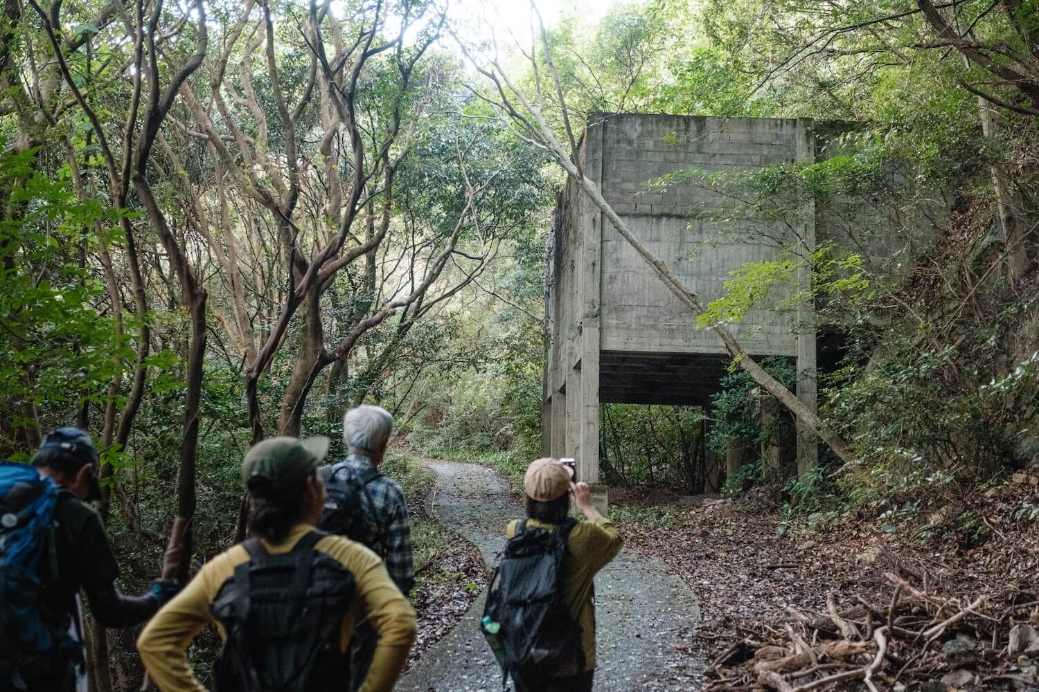登山口から歩き始めて5分。見えてきたのは、砕石工場のホッパー(石を一時的に貯蔵する施設)跡。炭鉱で栄えた筑豊の歴史が垣間見える風景につい立ち止まってしまいます。