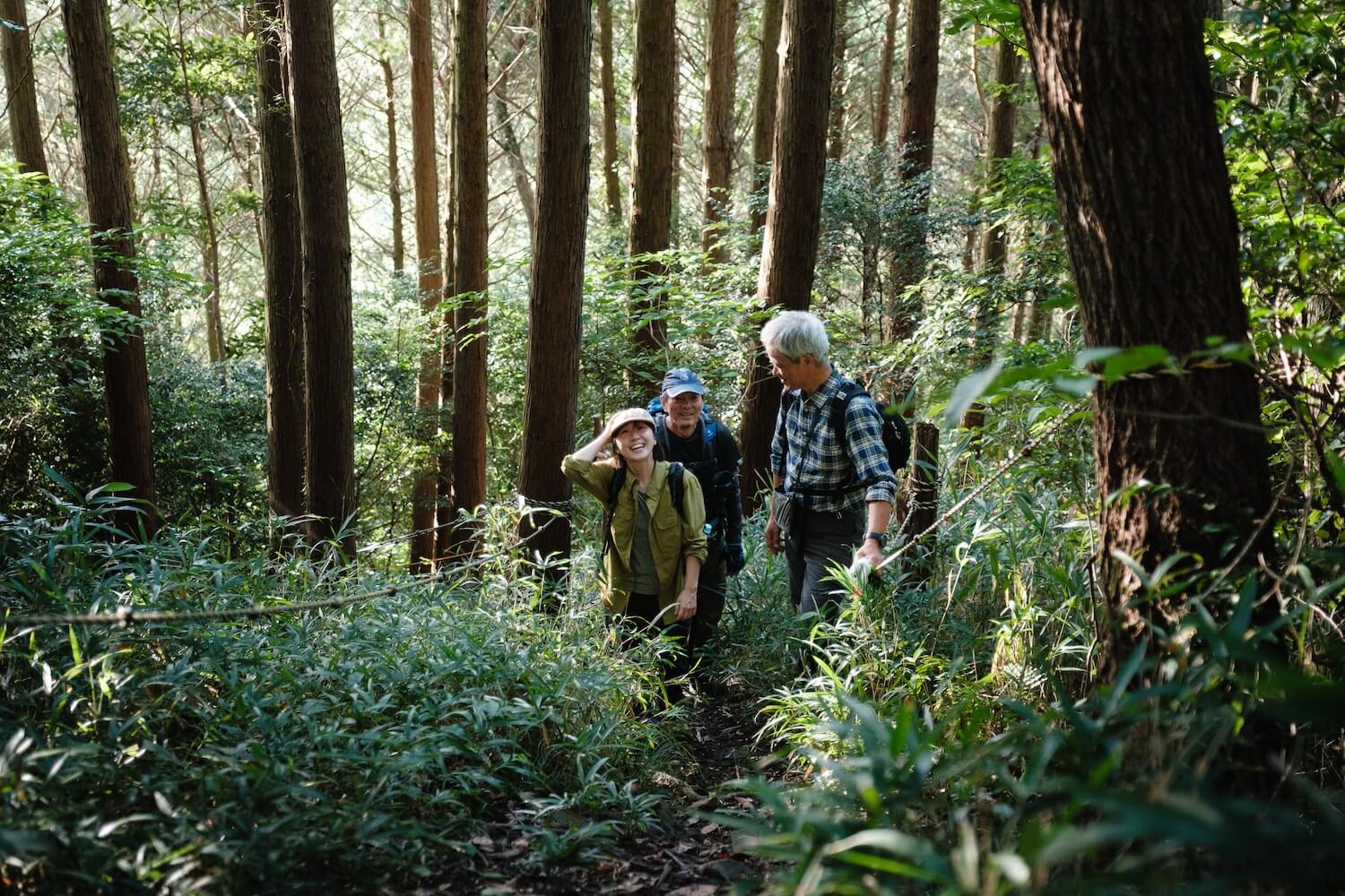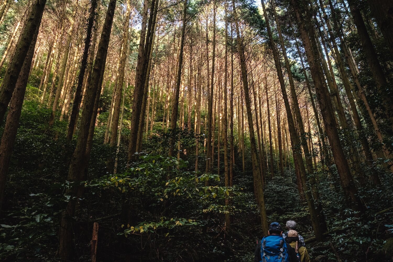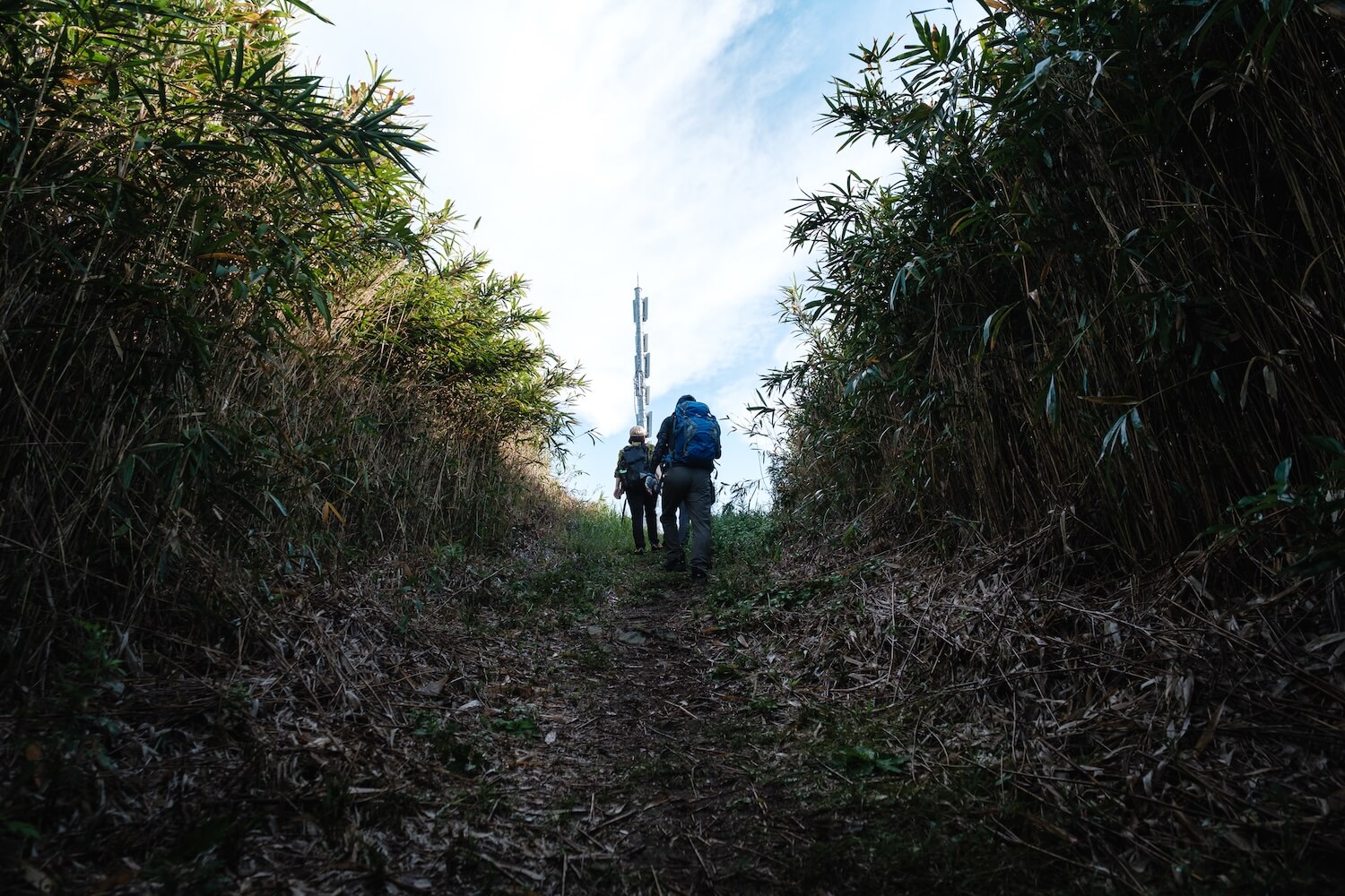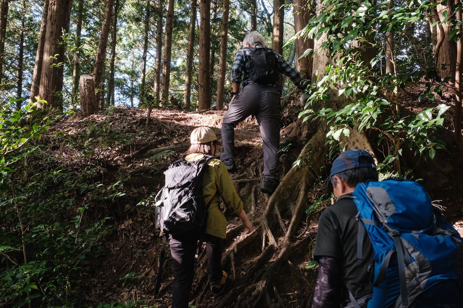 竹林の先、小さな沢を越えたあたりから最初の山頂まではやや急登気味です。粘土質の土やでこぼこした岩など足場の悪い箇所もありますが、お子さんや初心者の方でも無理なく歩ける程度ですので、ご安心ください。