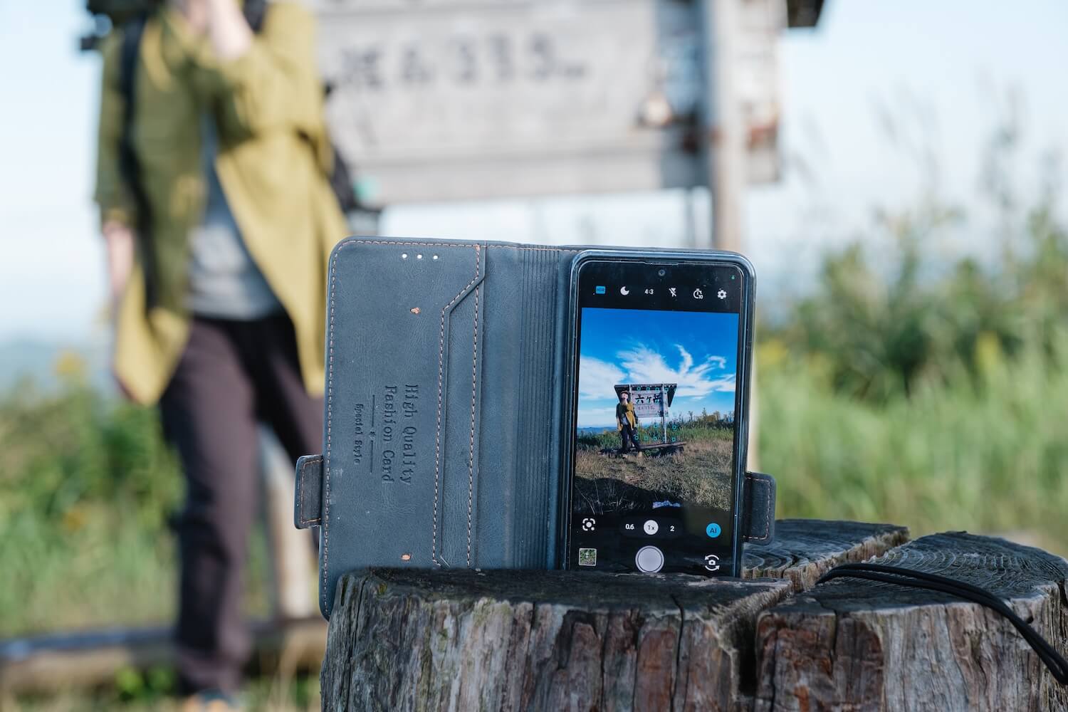 山頂にある記念撮影用スマホ立てもお手製です。切り株を運んで来たのは梶栗さん。差し込み口をチェンソーで作ったのは隊長。至るところに二人のアイデアが光ります。