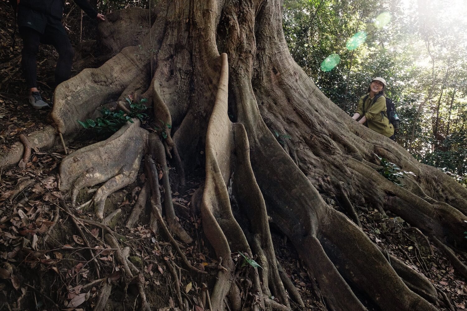 「龍ヶ岳北峰」そばにあるのは、スダジイの巨木。山の斜面に幅5mを超える板根を広げています。隊長が龍ヶ岳にちなんで「龍の右脚」と名付け、撮影スポットとしておすすめしているそう。近くにはもう2本のスダジイが聳え、これらをまとめて「板根三姉妹」と呼ぶのだそうです(笑)。