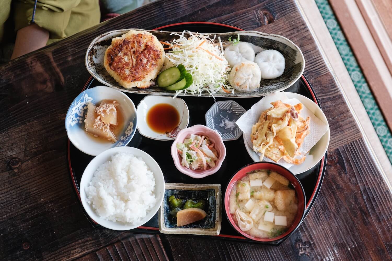 ぐうぐうなるお腹に手を当てながら選んだのは、一番人気の「海老ハンバーグともち餃子の定食」です。小鉢は農家の収穫や仕入れ状況による日替わり。おかずの天ぷらは食材が充実していると野菜のかき揚げになります。この日は幸運にも風味や食感が違う6種の野菜のかき揚げで、優しい味わいが最高でした。