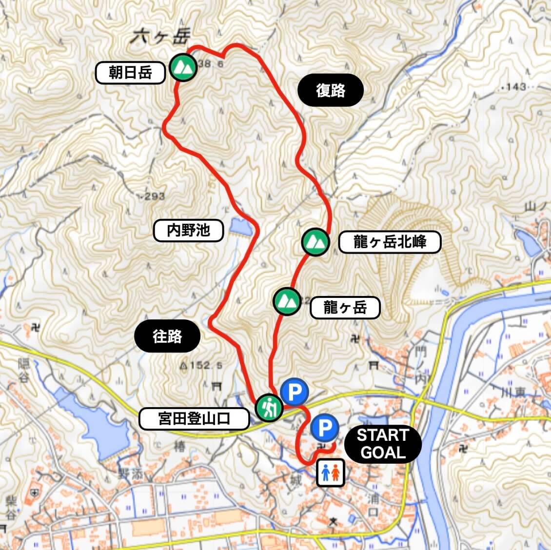 今回は宮若市側の登山口をスタートし、登頂後に別ルートから戻るコース。所要時間は2、3時間。(地図をタップすると拡大できます)。該当の地図はこちら