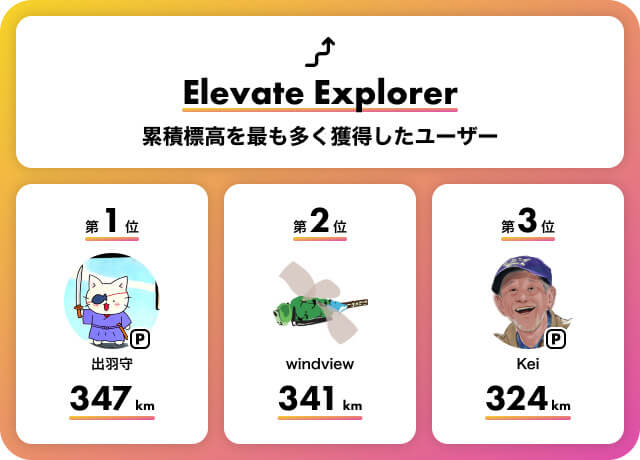 一年分の登りを合計した累積標高が大きい方に贈る「Elevate Explorer」は、宮城を拠点に活動する出羽守さんが受賞となりました。