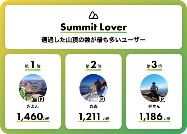 一年を通して、最も多くの山頂を通過(重複は除外)した「Summit Lover」に輝いたのは、昨年、一昨年に続き、岐阜を拠点に活動するきよんさん。