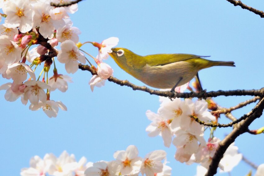 サクラの花蜜を吸うメジロ。ウメの花にもよくやってくる