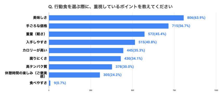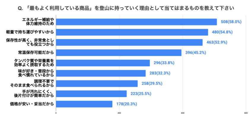 YAMAPユーザーアンケートでも約4人に1人(25.5%)が「手が汚れにくく、後片付けが楽」な点を行動食選びのポイントとしていました。手間が掛からない手軽さを重視している登山者が多いようです。