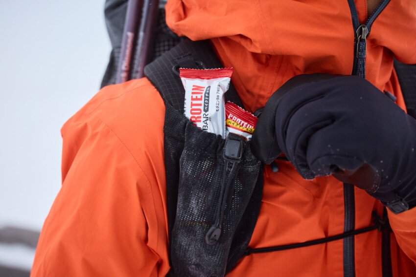 土屋さん「行動食はやはり手軽に取れるのがいいですよね。シェルのポケットからサッと取り出せたり、グローブのまま開封して食べられたり。寒い冬山ではグローブをできるだけ外したくないですし、外したら風で飛ばされたり、落として失くしてしまったりするリスクもあるので」。