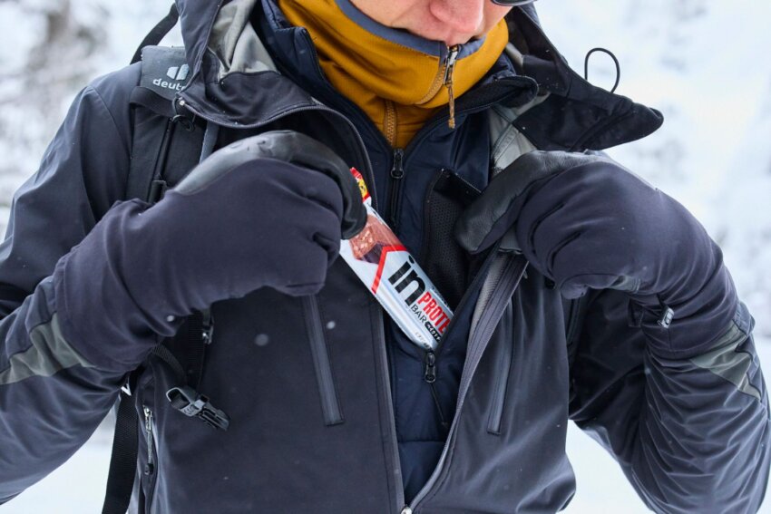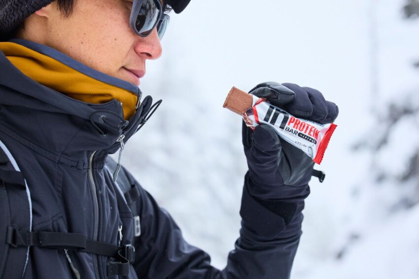 土屋さん「グローブを外す手間がなくなるのはうれしいです。僕はすぐに指先が冷え切ってしまうほどの末端冷え性なので。あと、バータイプだから、小分けにして食べるのも便利ですね。ひと口食べて、またポケットにしまって、ちょっとしたらまたひと口。歩きながらでも手軽に取れるので、まさに行動食にもってこいです」。