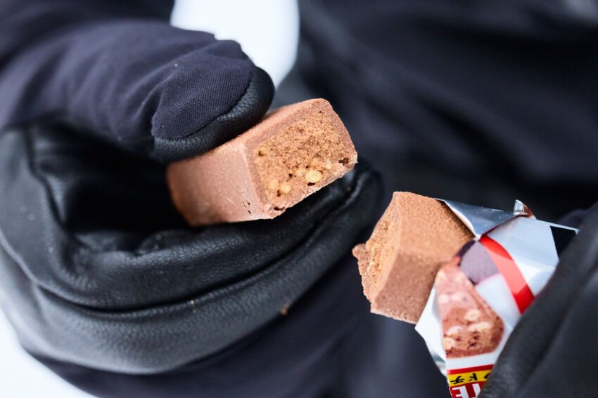 高カロリーで甘いチョコレートは、冬山行動食の定番のひとつ。しかし、行動中に食べようと胸ポケットに入れるとドロドロに…持ち運びやウエアを汚さないように食べるなど、意外と気を使うこともあります。
