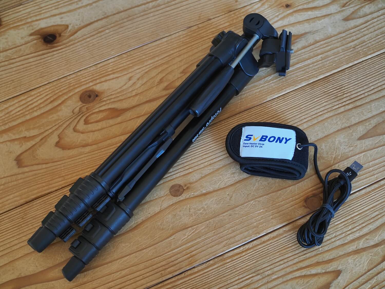 レンズヒーターは3千円弱、三脚は高さが100cm程度の簡易なもので、こちらも3千円弱。合計6千円以内に収まった。
