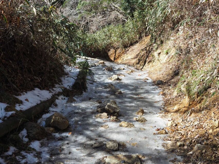 冬季の最低気温は約ー7℃となります(YAMAP)。ただし、10㎝以上の積雪日数はわずか2日程度で、それも長く残ることはあまり多くありません。ただし、登山者の踏みつけによる登山道の凍結はしばしば起こるため、冬季は簡易アイゼンやチェーンスパイクを携行しましょう。