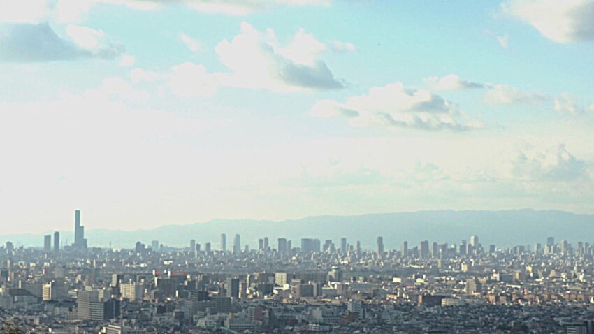 生駒山系からは、まさに大阪市街の「向こう」に六甲山系が横たわる