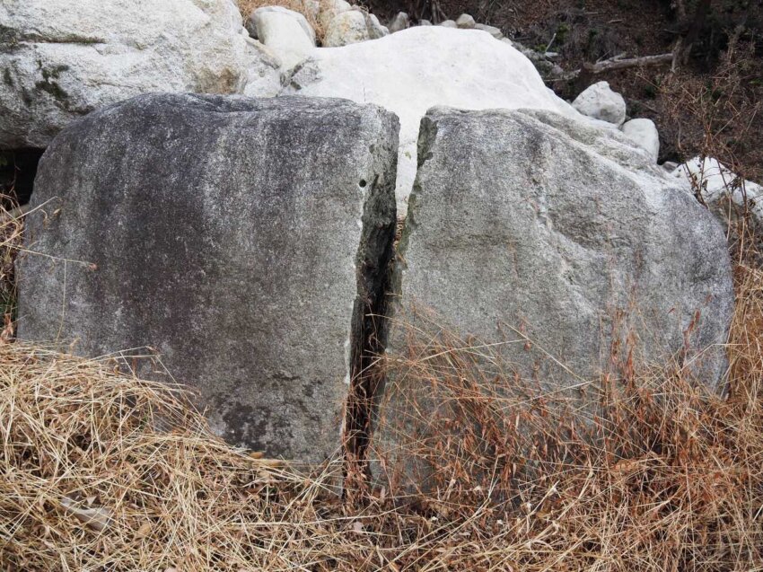 石切道にみられる、切り出し途中で放置された岩。楔(くさび)の跡が残る