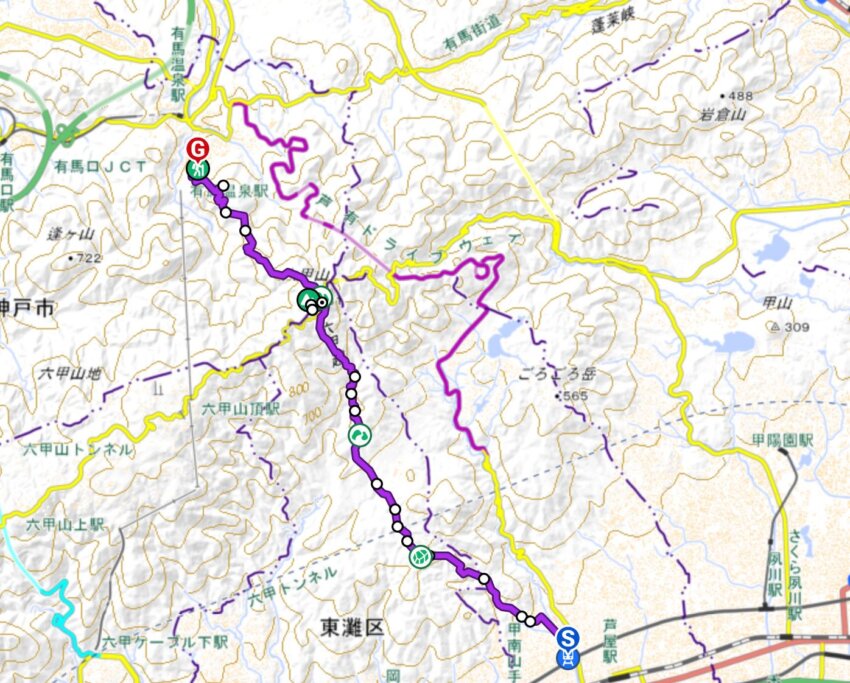 芦屋川駅~高座ノ滝~風吹岩~雨ヶ峠~一軒茶屋~六甲山最高峰~(魚屋道)~有馬温泉駅