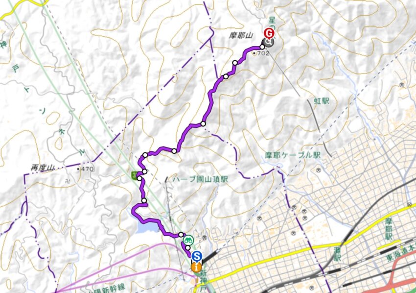 新神戸駅~布引ノ滝~桜茶屋~(天狗道)~摩耶山~掬星台~(上野道)~摩耶ケーブル下駅
