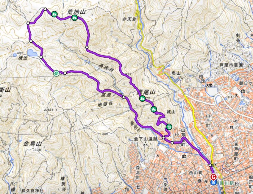 芦屋川駅~鷹尾山~岩梯子~新七右衛門嵓~荒地山~風吹岩~高座ノ滝~芦屋川駅