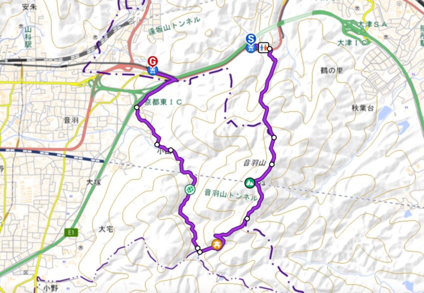 音羽山(593m)は、京都市と大津市を分ける尾根上にあります。古来より歌枕としてよく和歌の題材となり、三十六歌仙の紀貫之が詠んだ「秋風の吹きにし日より音羽山峰のこずえも色づきにけり」などが知られています。