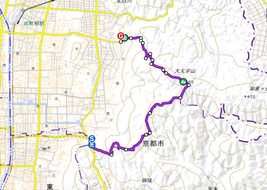 「五山送り火」で名高い大文字山(465m)。京都の中心街に隣接し、手軽に登れることから高い人気を誇り、登山道も数多く発達しています。どのルートを歩くかを予め決めておき、分岐ごとに計画ルートを確認しながら歩けば、ルートファインディングの基本が学べるのも見逃せないところです。