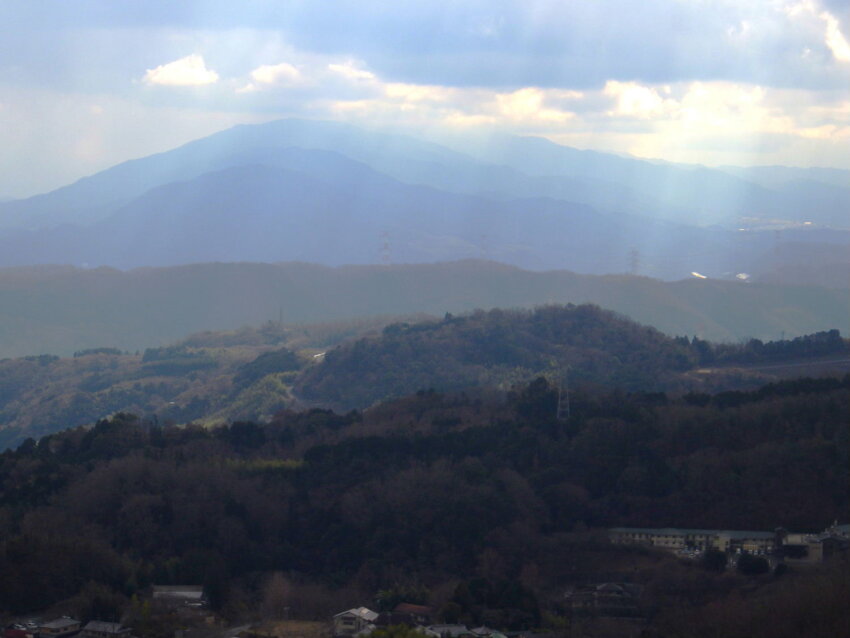信貴山山頂からは、二上山、大和葛城山、金剛山が重なって見える