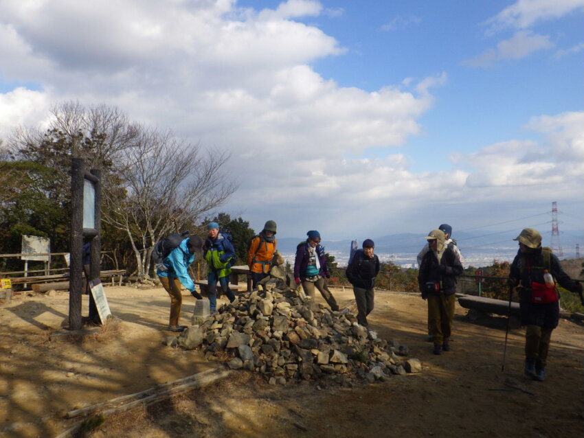 大福山(427m)は、山頂の北側直下に葛城二十八宿の第3番経塚があります。俎石山(まないたいしやま、420m)は、大阪府に一等三角点が4カ所ある中で唯一の本点があり、山頂直下の北展望台からは、大阪湾の広大な眺めが得られます。