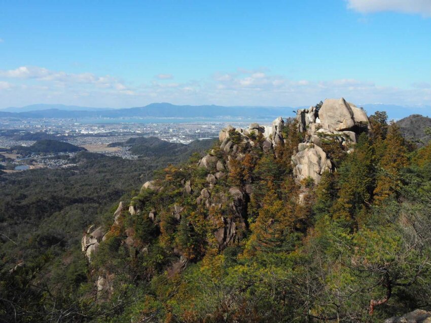山頂からは、ほぼ全方位の展望が得られます。特に東側は、半国山、比良山系、愛宕山、比叡山など京滋の名山をズラリと眺めることができます。また、山頂北側では、岩くぐりが楽しめます。