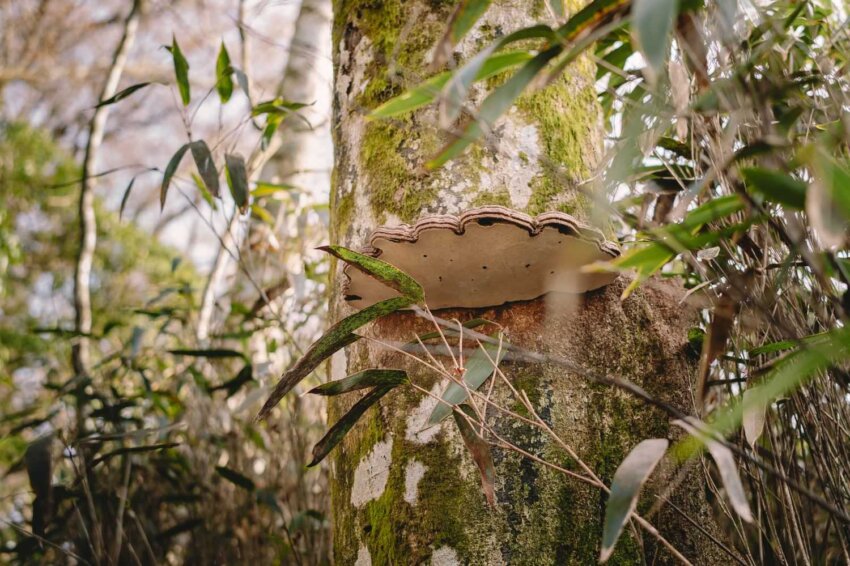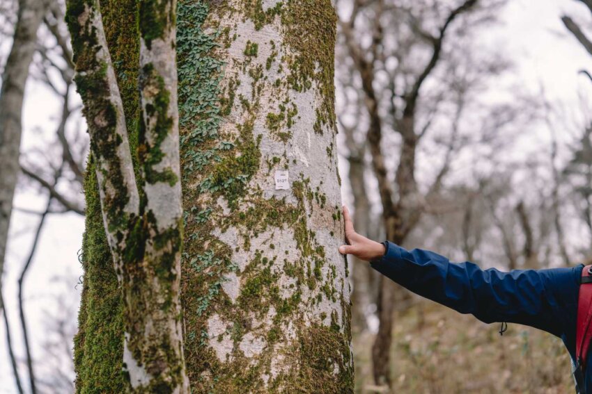 特に印象的だったのが、ブナの樹皮に見られる模様の話。この模様は、菌類と藻類が共生する地衣類によるもの。菌は安定した住処や空気中から得た水分を、藻は光合成による栄養を提供します。水をたっぷり蓄えるブナの樹皮は、共生にとって理想的な環境なのだそうです。「この辺りは超一等地“ブナヒルズ”ですよ!」と山之内さん。