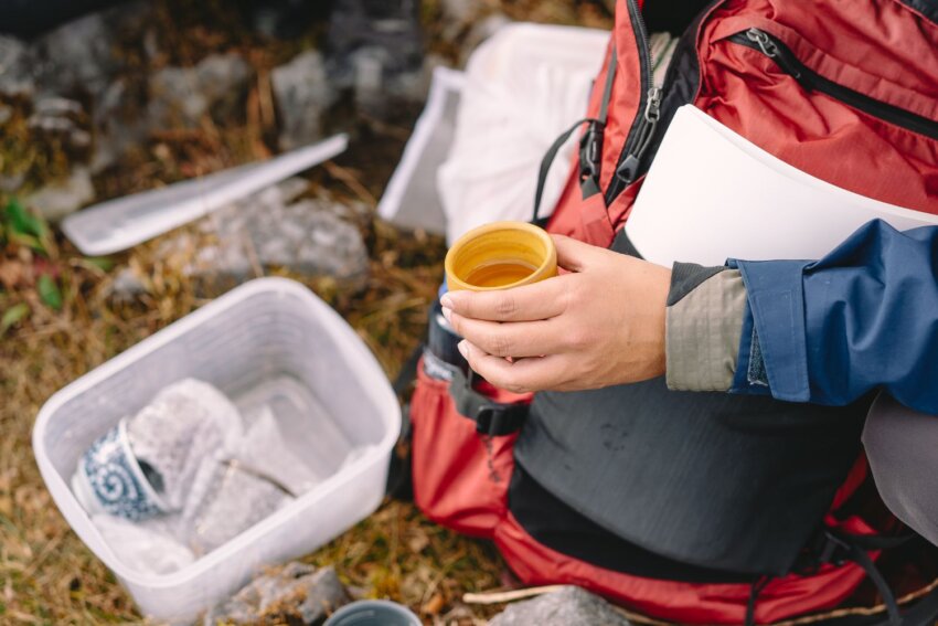 歩き終えたあとにふるまわれたのは、山之内さんお手製のクロモジ茶。土地の土を使った器とともに、深い余韻を残す時間となりました。