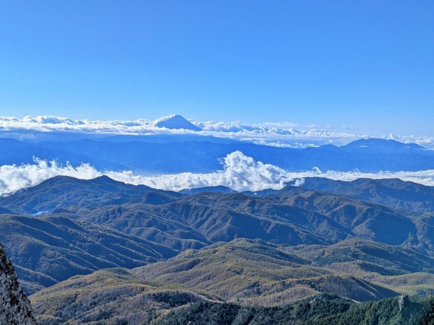 奥秩父山塊からは、同じく日本百名山の甲武信ヶ岳(2475m)や最高峰・北奥千丈岳(2601m)など随所から富士山を眺望することが可能。